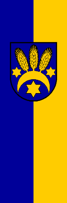 | Description of arms (German): | In Blau eine goldene, gestürzte, mit drei goldenen Gerstenähren fächerförmig besteckte Mondsichel, begleitet von drei goldenen Sternen, und zwar einem größeren unten in der Höhlung des Halbmondes und zwei kleineren oben zu beiden Seiten der Ähren. |