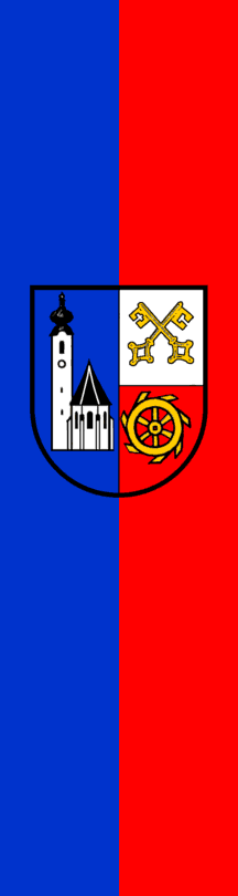 | Description of arms (German): | In einem gespaltenen Schild, vorne in Blau eine silberne Kirche mit schwarzem Dach und Turmhelm, hinten in Silber und Rot geteilt, oben ein gekreuztes schwarzes Schlüsselpaar, unten ein goldenes Schaufelrad. [1] |