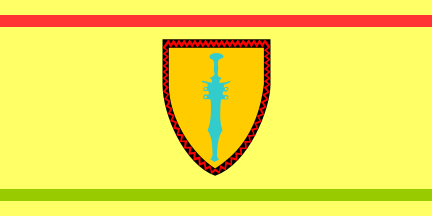 The flag (photo) is pale yellow with the coat of arms in the middle between two horizontal stripes near the edges, at top light red and at bottom light green. The colour shades of the flag are: