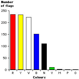 More than two-thirds (264) of these flags are bicolor. All possible combinations of the six main colours are used, except blue-green.