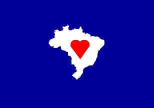 A blue flag with a map of Brazil in white, and on it a red heart.