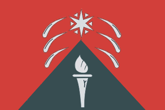 A red field, a black triangle arising from the base, bearing a white torch, and above the triangle a white six-pointed star with small white triangles between the points; emanating from the star six white splashes.