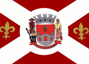 A dark red flag with a broad white saltire with in the centre a white disk bearing the municipal arms and in the hoist and fly quarters a golden fleur-de-lys.