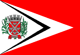 The flag of Tarumã, designed by Lauro Ribeiro Escobar, is prescribed by Municipal Law No. 58, adopted in 1993 The flag is red with a white triangle placed along the hoist and reaching the mid fly, charged with the municipal coat of arms and a thin black chevron.