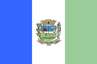 The flag of Turiúba is vertically divided blue-white-green with the municipal coat of arms in the middle.