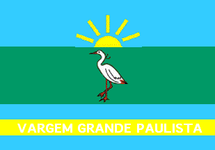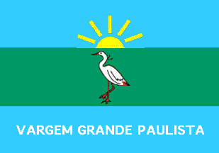 The flag of Vargem Grande Paulista is with dimensions 8 units x 11 units, compliant with the Brazilian legislation*, made of three horizontal stripes. The upper stripe is celeste blue with a six-rayed yellow rising sun. The central stripe is spring green, charged with a white heron in profile. The lower stripe is celeste blue with the writing "VARGEM GRANDE PAULISTA" in white letters outlined in black.