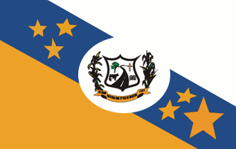 A descending diagonal tricolour, white over blue over deep yellow, with the municipal arms on a white oval in the centre and three deep yellow stars on each end of the blue stripe.