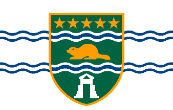 A crest divided by three wavy lines featuring five gold stars, a gold beaver and a building.