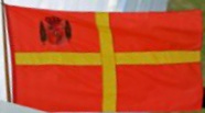 yellow cross on a red field bearing a badge in the upper quadrant of the fly.