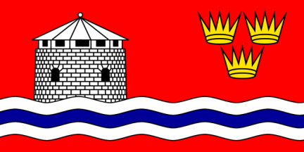 Kingston's flag is a banner of arms, showing the Martello Tower above three