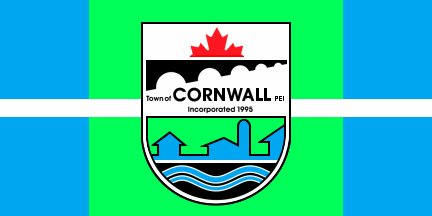 The two blue rectangles represent the North River and West River with the land (green) in the middle and the town crest to represent Cornwall in the centre. The white strip through the centre represents the (TransCanada) highway that intercepts the Town. The flag became the official for Cornwall in November 2006. - information and image of the flag courtesy by Geneen Bergman from the Town Administration.