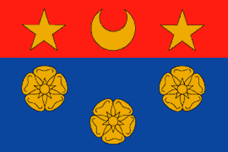 Description: A banner of the Arms; Coat of arms: Azure three roses Or, on a chief Gules a crescent between two mullets Or