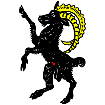 Argent an Ibex rampant Sable horned Or and and priapic in his virility Gules.