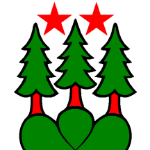 Argent three Fir Trees Vert trunked Gules issuant from a Mount of 3 Coupeaux of the second and in chief two Mullets of Five of the third.