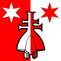 Per pale Gules and Argent overall a Ploughshare conjoined with a Patriarchal Cross and in chief two Mullets all chounterchanged.