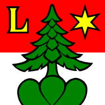 Per pale Gules and Argent overall a Fir Tree Vert issuant from a Mount of 3 Coupeaux of the same and in chief dexter letter L Or and in sinister a Mullet of the last.