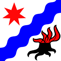 Argent a Bend sinister wavy Azure between a Mullet of seven Gules and a Stump eradicated Sable flambant of the third.