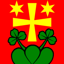 Gules a Cross pattee couped Or between in chief two Mullets of the same and in base two Trefoilts issuant from a Mount of 3 Coupeaux Vert.