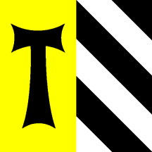 Per pale, Or a letter Tau Sable, and bendy of six Sable and Argent.