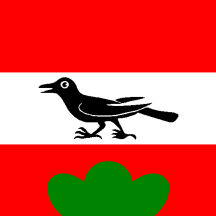 Gules, on a Fess Argent a Crow Sable passant and in base Coupeaux Vert.