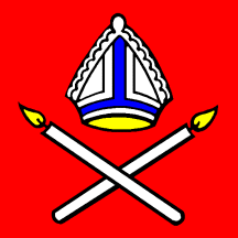 Gules a Mitre Argent in chief and two Candles of the same inflamed in saltire in base.