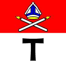 Per fess Gules two Candles Argent inflamed proper and a Mitre of the second addorned Azure and Argent a Tau cross Sable.