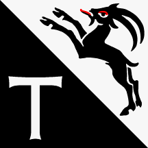 Per bend Argent an Ibex rampant Sable langued Gules and of the second a Tau cross of the first.
