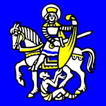 Azure St. Martin riding a Horse Argent halving the cloak to a beggar.