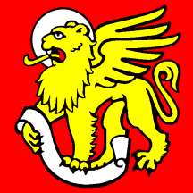 Gules a Lion passant winged Or haloed and holding a Scroll Argent.