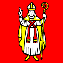 St. Valentin clad Argent and caped Or with his dexter raised in blessing and