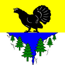 Per fess, Or, a Grouse passant Sable, and Azure, a Gorge Argent with Pine-trees Vert.