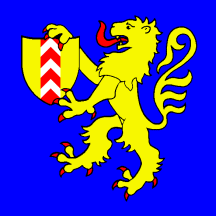 Azure, a Lion rampant Or Langued and armed Gules holding in front paws an escutcheon of Neuchâtel (Or, on a pale Gules three chevrons