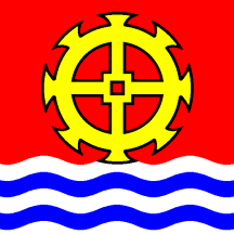 Gules on a Base Argent wavy two bars wavy Azure and overall a Mill Wheel Or.