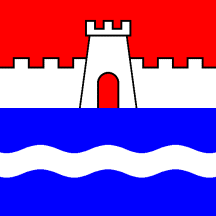 Per fess Gules a Wall embatteded throughout with a Towered Gate all Argent and Azure a Bar wavy Argent.