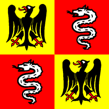 Quartered first and fourth Or an Eagle Sable langued, beaked and membered Gules and second and third Gules a Serpent Argent.
