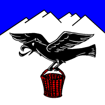 Azure in base of the mountains Argent an eagle voland holding in its claws a basket Gules