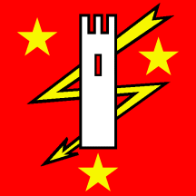 The flag of Chiggiogna represents past and present of this commune. The tower ("dei Pedrini") adjoining to the parish church, confirms the importance of this village in the mediaeval days of the Longobardi. The three stars alludes to Chiggiogna and its two fractions of Lavorgo and Fusnengo while the flash of lightning symbolizes electricity, industry which gave the impulsion to the commune by creating jobs.