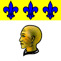 Argent a head couped at neck and bald proper and in chief or three fleurs-de-lis azure.