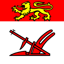 Argent a plough gules and in a chief of the same a lion passant or.