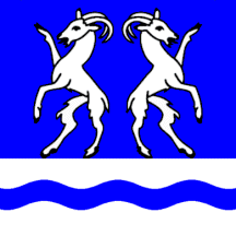 Azure two goats salient addorsed argent and in base argent a bar wavy of the first.