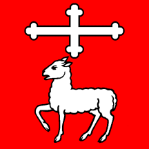 Gules a lamb passant argent and in chief a cross bottony of the same.