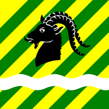 Bendy sinister of twelve or and vert a he-goat's head couped sable and in base a bar wvay argent.