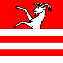 Per fess gules a semi goat rampant issuant argent crowned or and argent two bars gules.