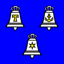Azure three bells argent each ensigned with a tau cross, an anchor and a mullet or respectively.
