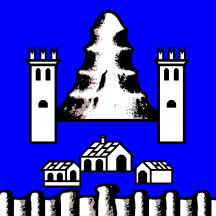 Azure, a conical mountain with its base in fess point, between two towers, their bases lower, each with three swallow-tailed crenellations and three windows sable, 2 and 1; in base a precipice at the edge of which is a village of three buildings, 1 and 2, all argent.