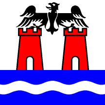 Argent an eagle displayed sable stantant on two towers embatteled gules issuant from a base azure and on it a bendlet of the first.