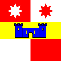 Quartered gules and argent in each chief quarters a mullet of eight counterchanged and overall on a fess or a gates with two towers azure.
