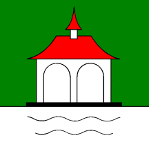 Vert, Tell's Chapel Argent roofed Gules on a lake of the second.