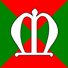 Per Saltire Gules and Vert, overall capital letter M Argent.