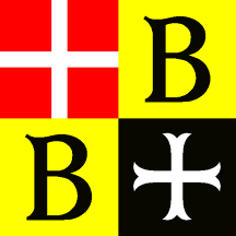Quartered, first Gules a Cross Argent, second and third Or a letter B Sable, and fourth Sable a Cross moline Argent.
